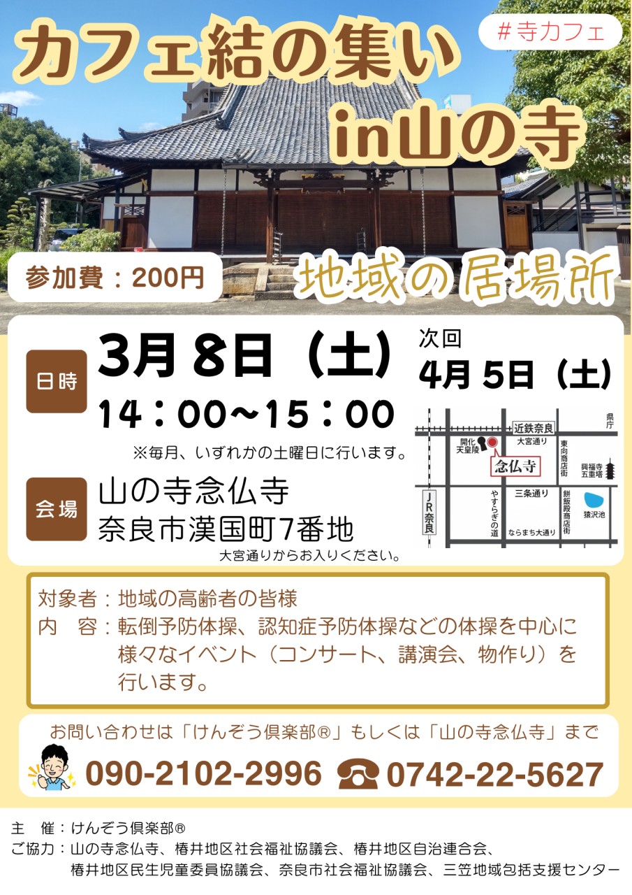 お問い合わせは「けんぞうクラブ」(090-2102-2996)、もしくは山の寺(0742-22-5627)までご連絡ください