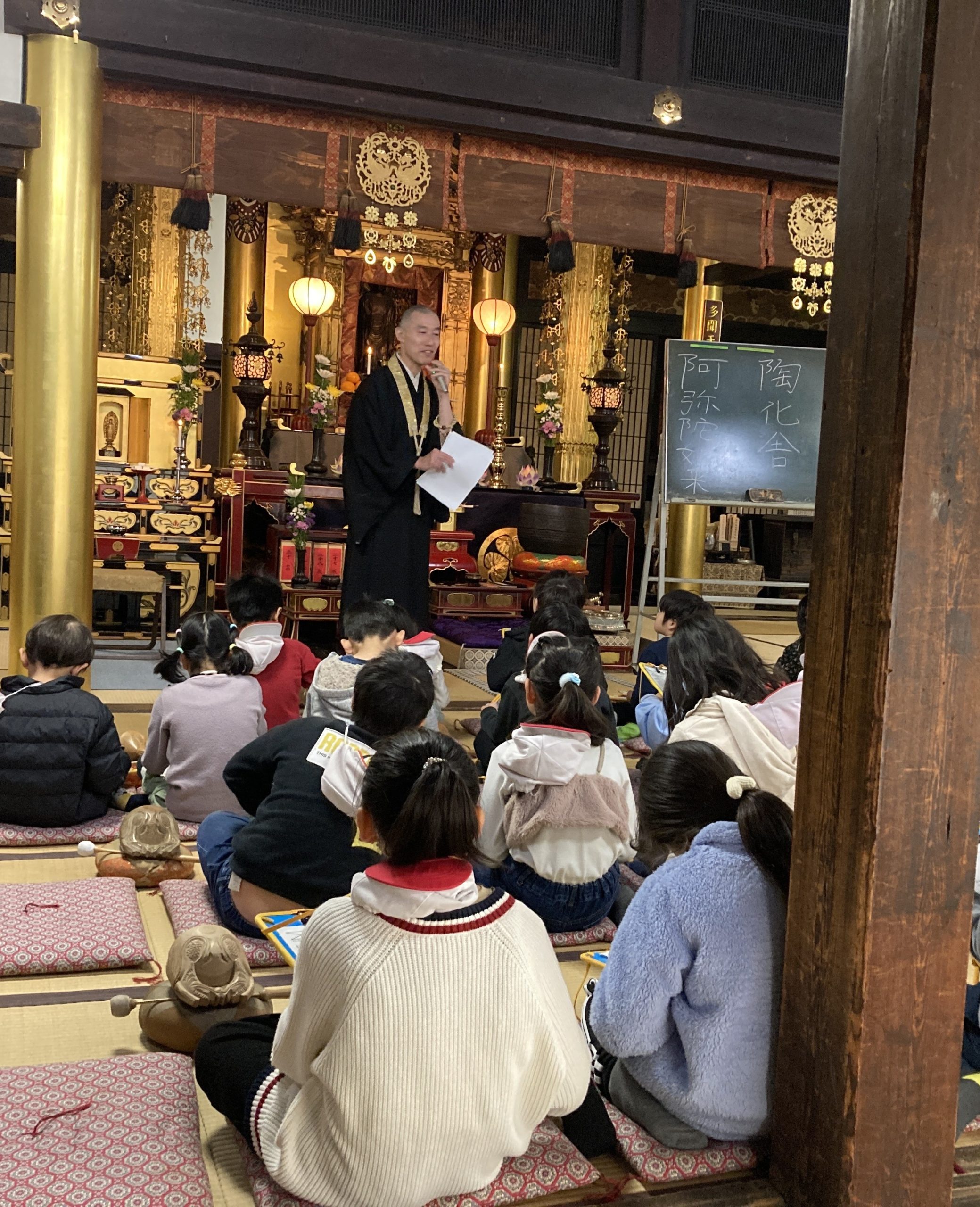 3月6日、椿井小学校の2年生による校外学習が山の寺念仏寺で行われました。住職による法話、質疑応答の後、木魚体験、数珠繰り、鐘撞き体験を行いました。大変熱心に話を聞き、一生懸命メモを取る姿、また鐘を撞いて良い音が出た時の満面の笑顔がとても印象的でした。